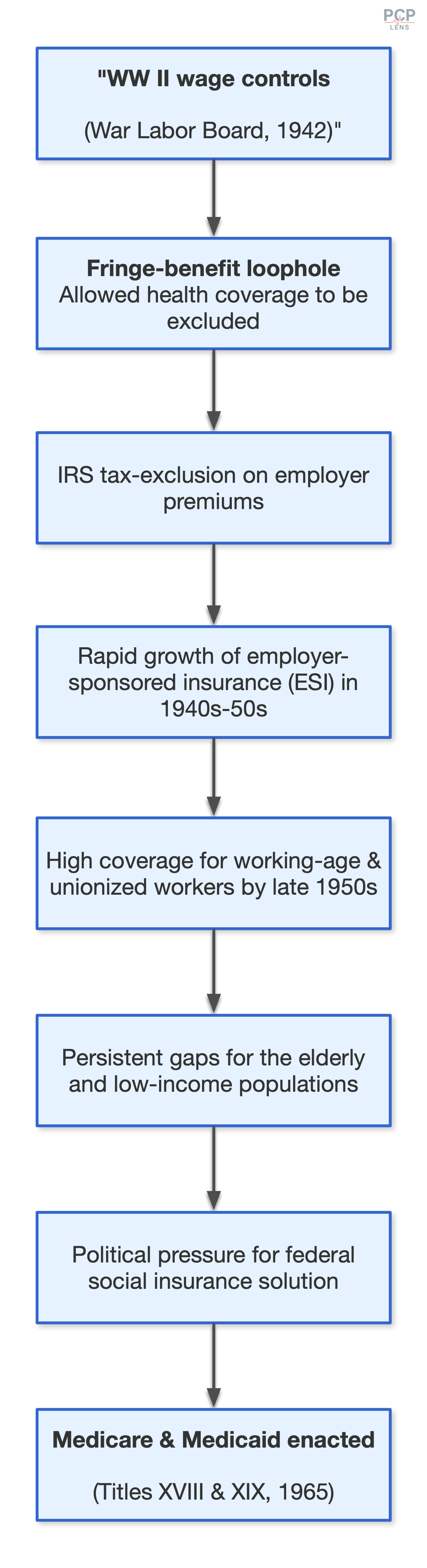 As working people were covered by insurance, political pressure gradually built up to extend coverage to the elderly and low-income population. This political pressure led to the birth of Medicare and Medicaid in 1965. This path dependence is demonstrated in the flowchart below.