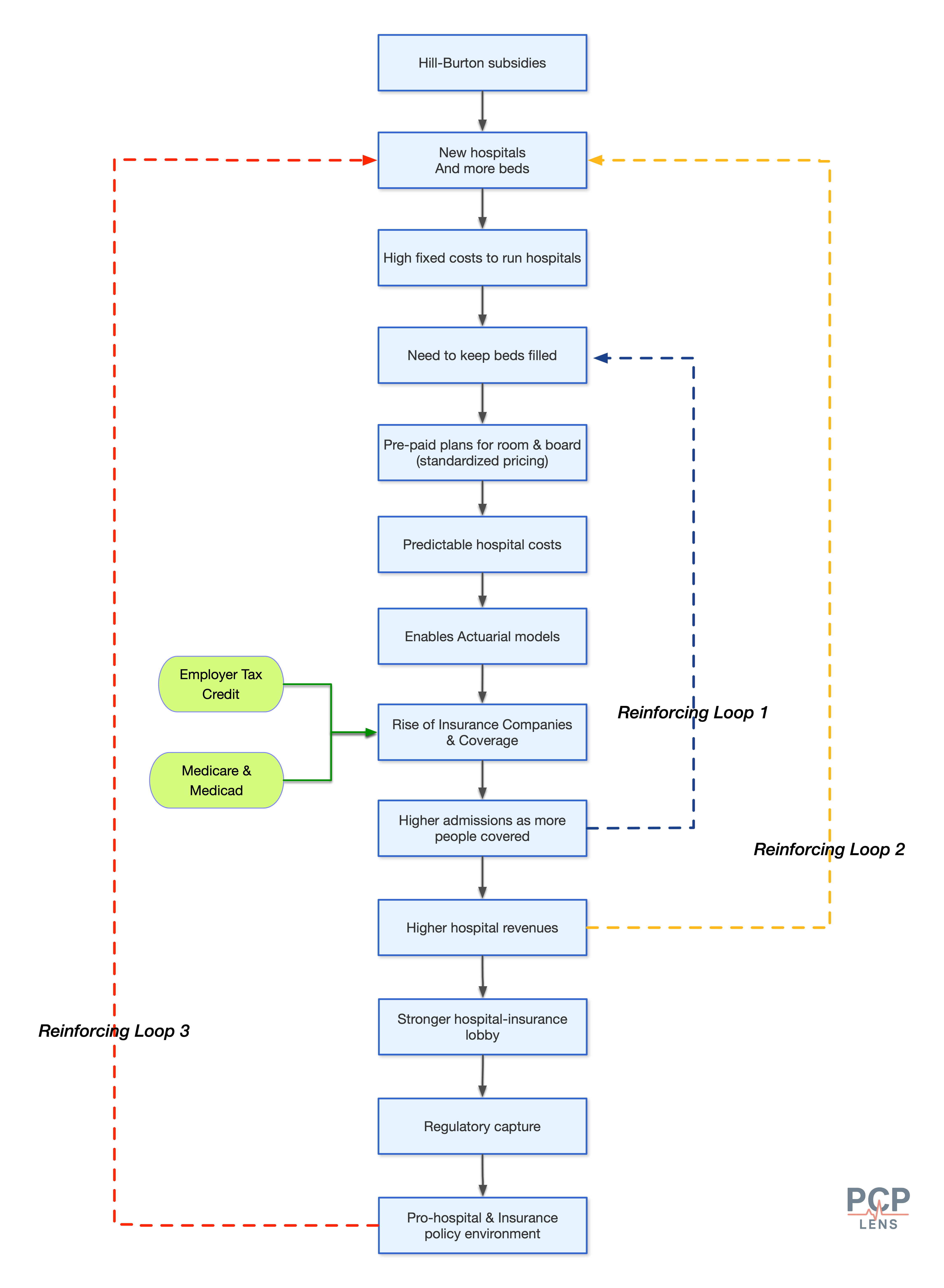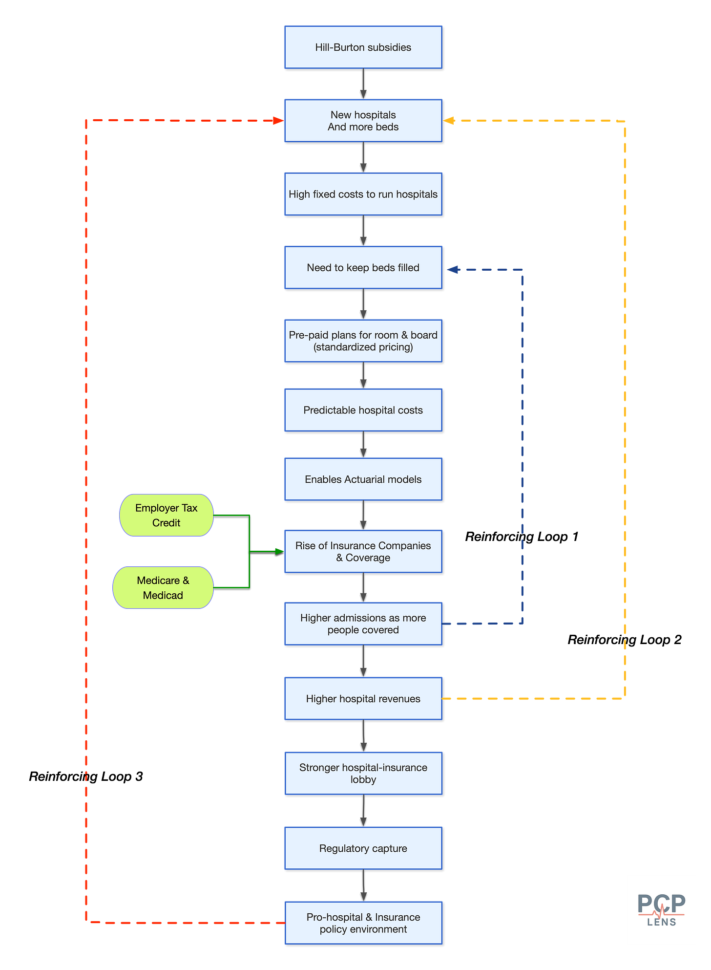 Hill-Burton accelerated the market for health insurance by focusing exclusively on hospital construction and set off at least three self-inforcing loops with increasing returns,5 which is demonstrated in the flowchart below.