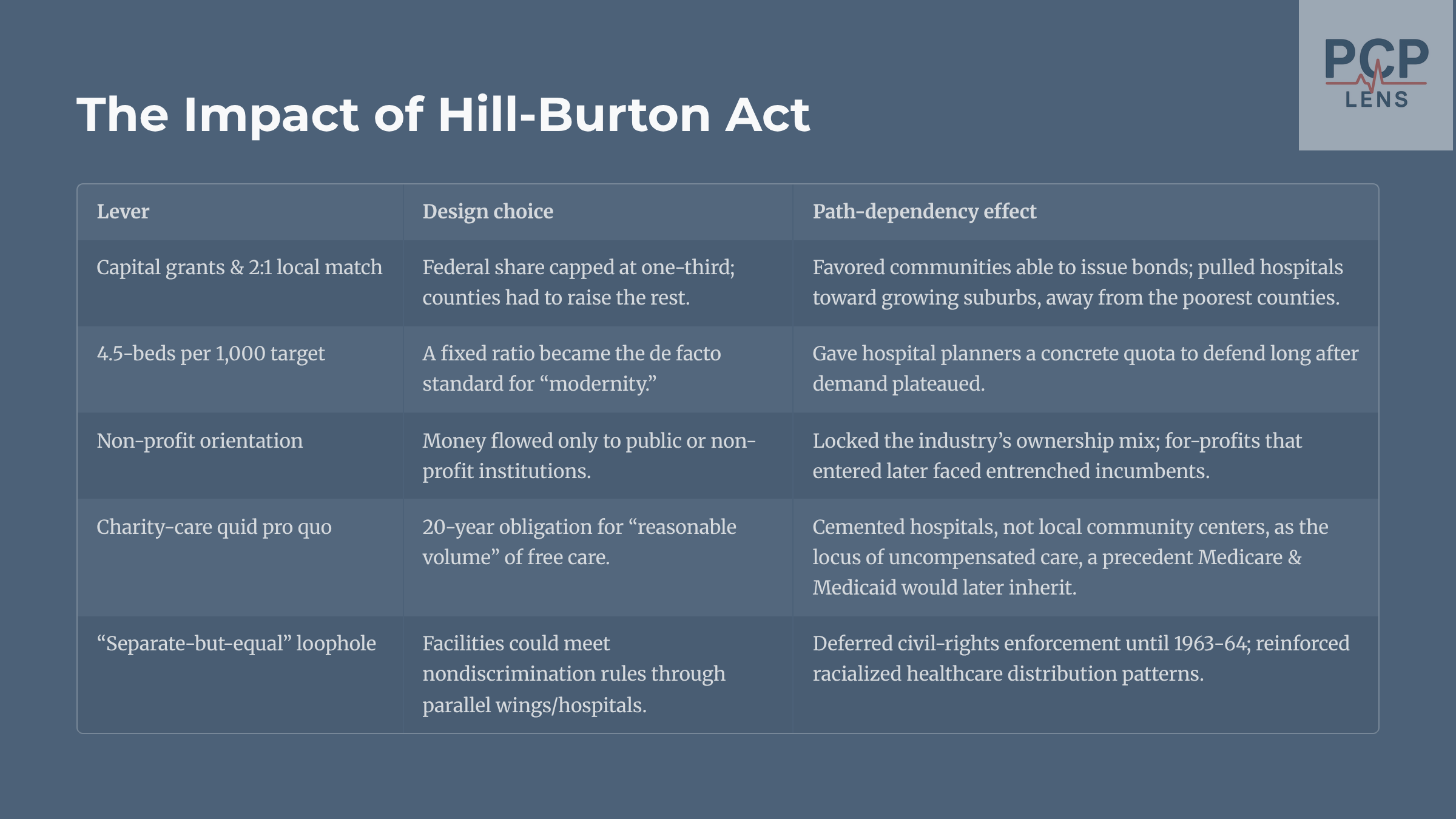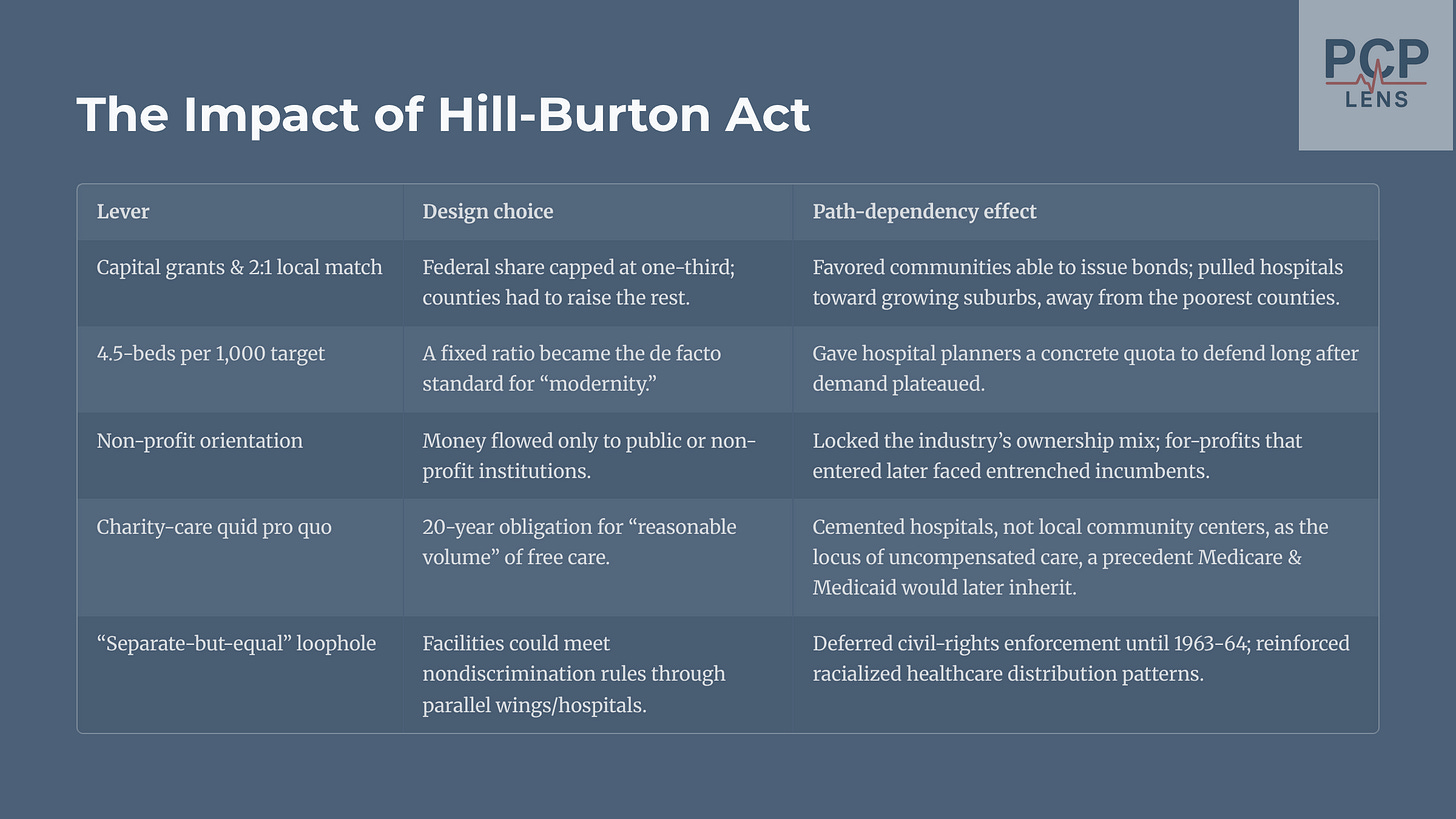 The Hill-Burton Act is the second major, path-dependent reason for this outcome. Having built our healthcare system around these ‘cathedrals of medicine,’ the question we face today is how we can build the community-level infrastructure that was neglected for so long.
