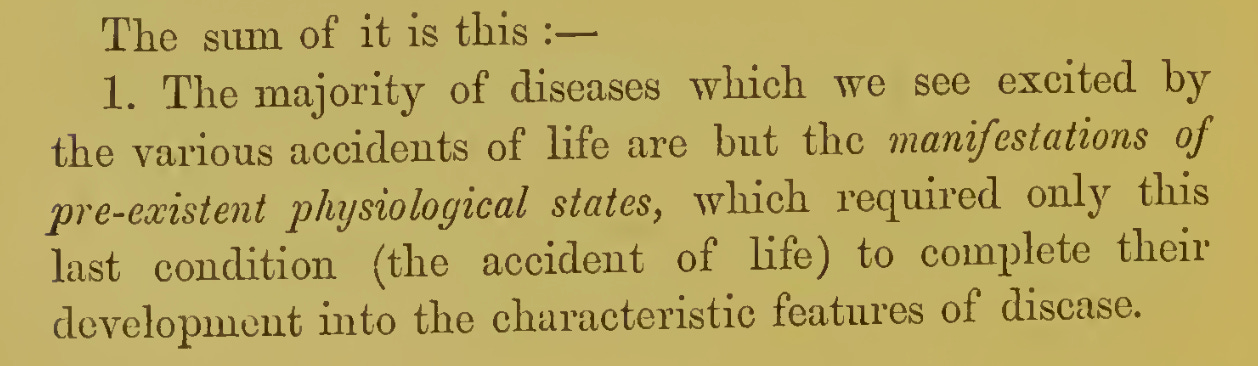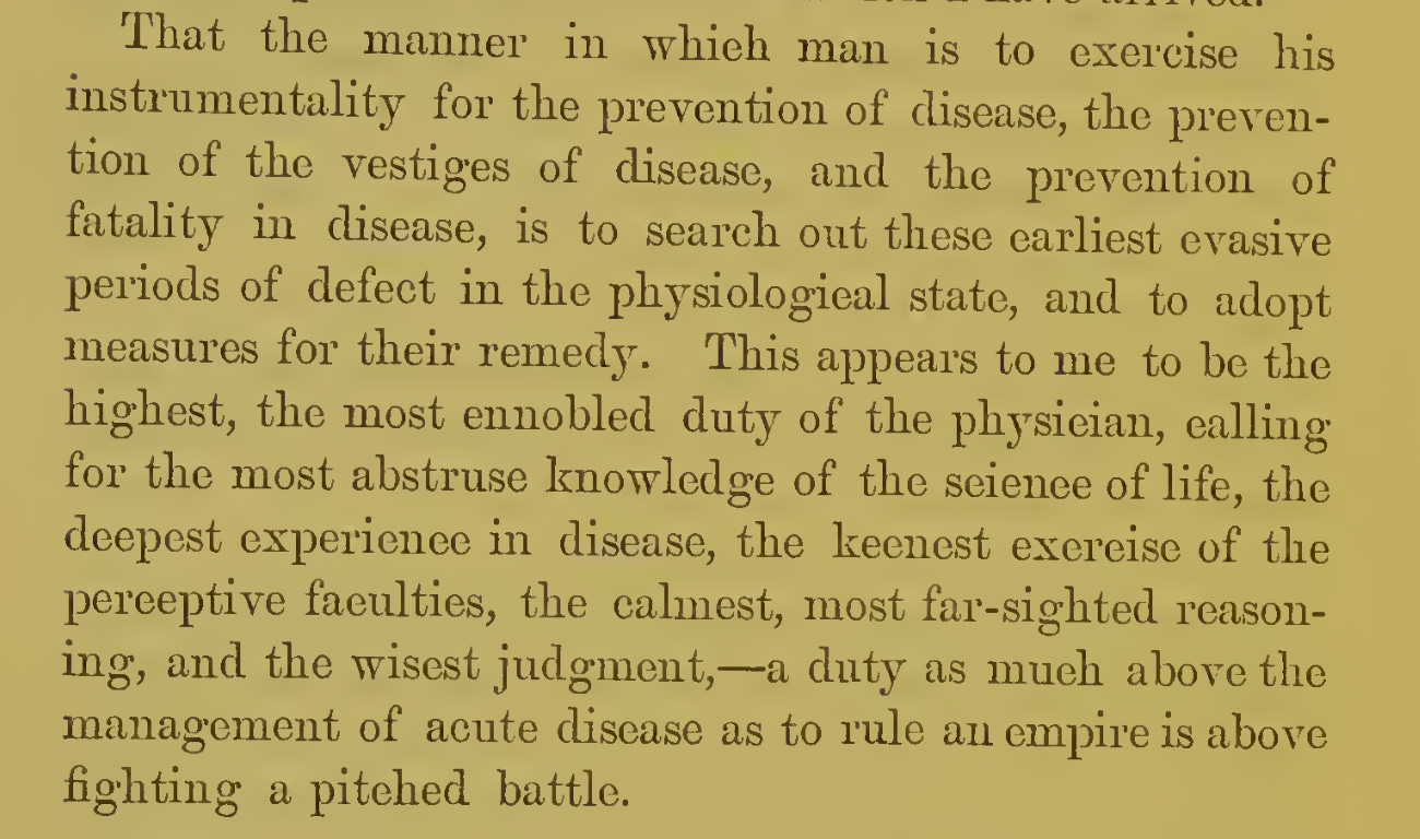 In 1861, British physician Horace Dobell published “Lectures on the Germs and Vestiges of Disease, and on the Prevention of the Invasion and Fatality of Disease by Periodical Examinations” (PDF Link). In these lectures, he proposed that disease was not a sudden event but a process, and the highest duty of the physician is to find these processes at their earliest stage and remedy them.
