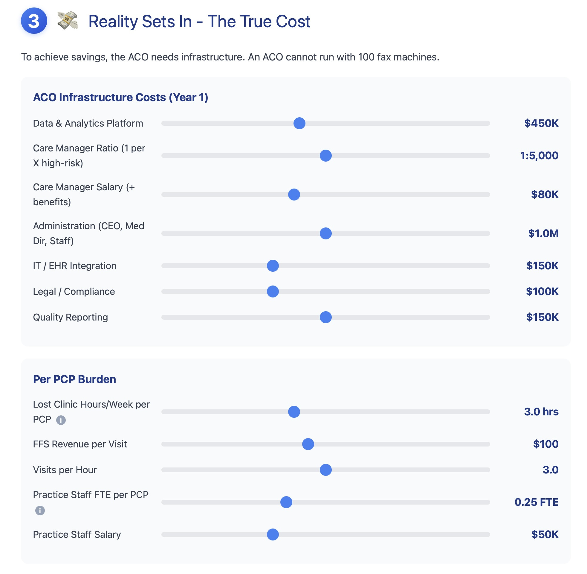 This step simulates the costs required to establish an ACO. These are fixed costs that are incurred regardless of whether the ACO achieves shared savings. If the ACO cannot meet its fixed costs obligations, it will fail.