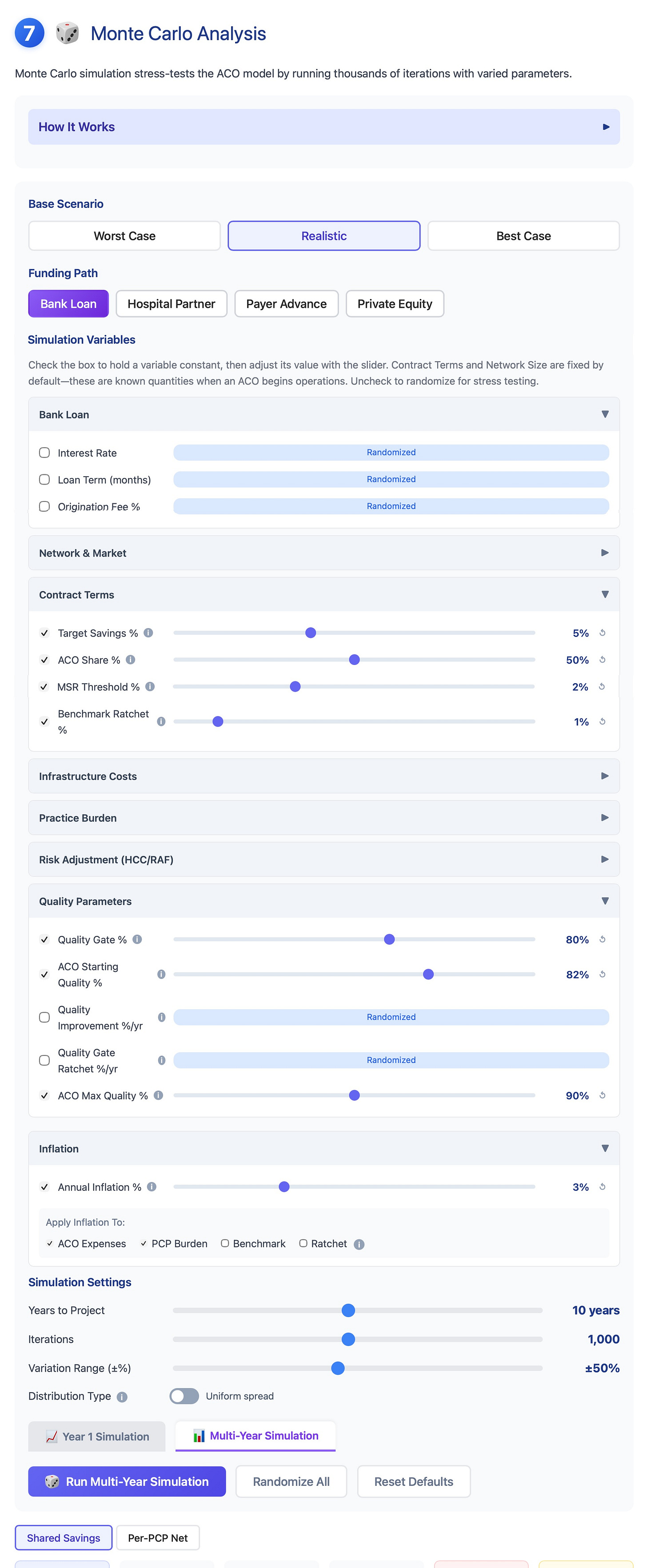 Monte Carlo simulation is a technique that allows the user to run thousands of “what if” scenarios, each time varying the input assumptions. Using this technique, we can model the probability distribution of the ACO’s financial performance.