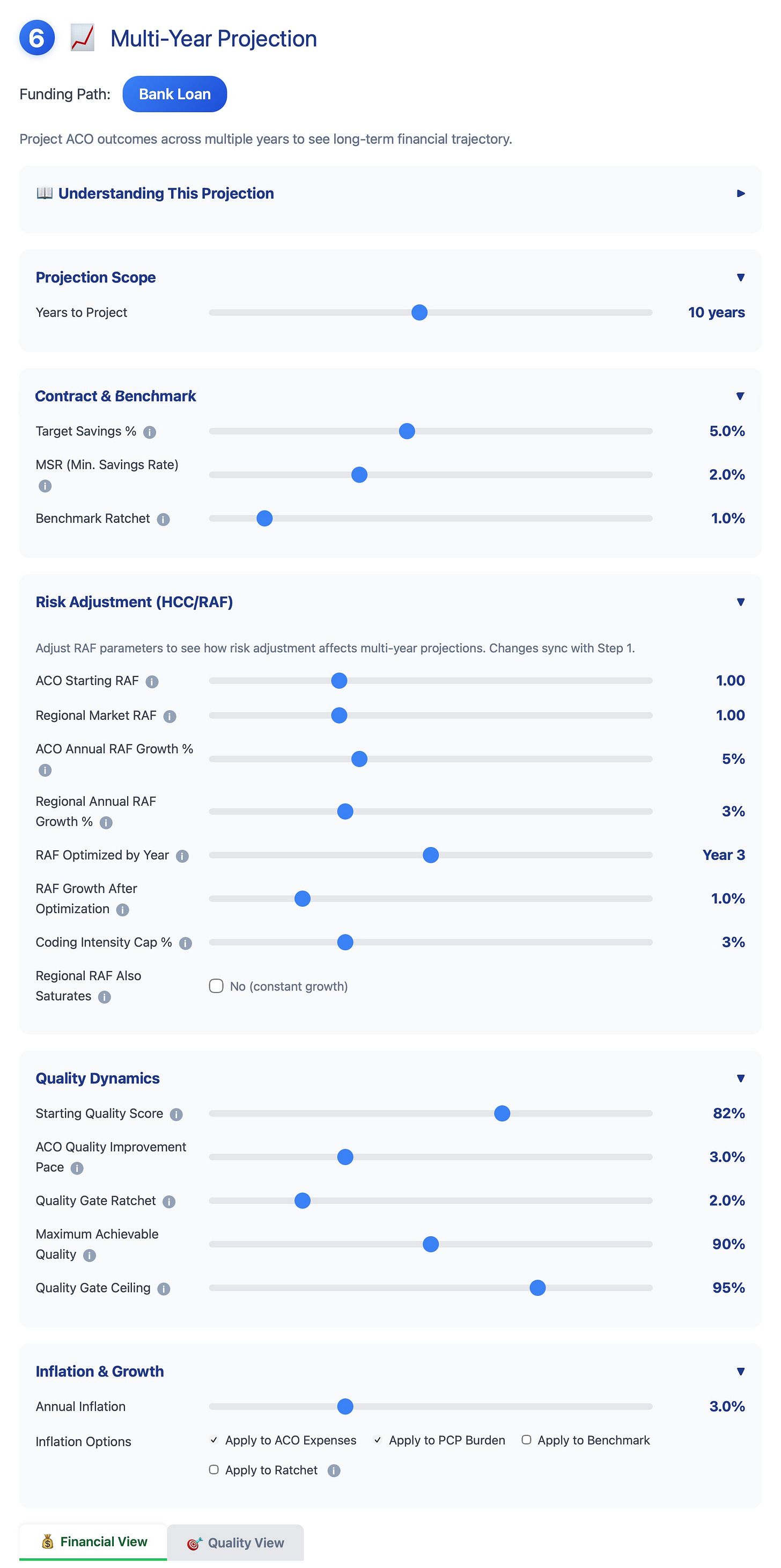 This step allows the user to project the ACO’s financial performance over several years (assuming the ACO succeeded in Year 1), either using the original assumptions or by modifying them on this page.