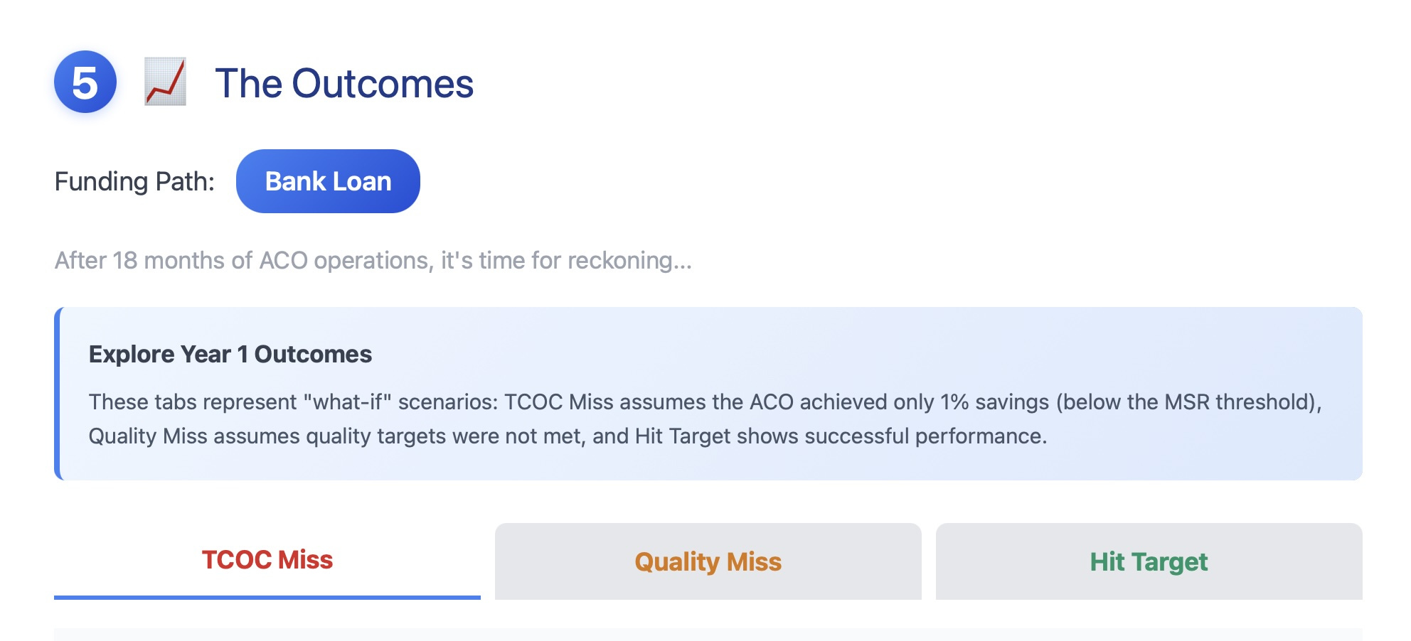 This step shows Year 1 outcomes after reconciliation. The ACO may fall into one of three categories: