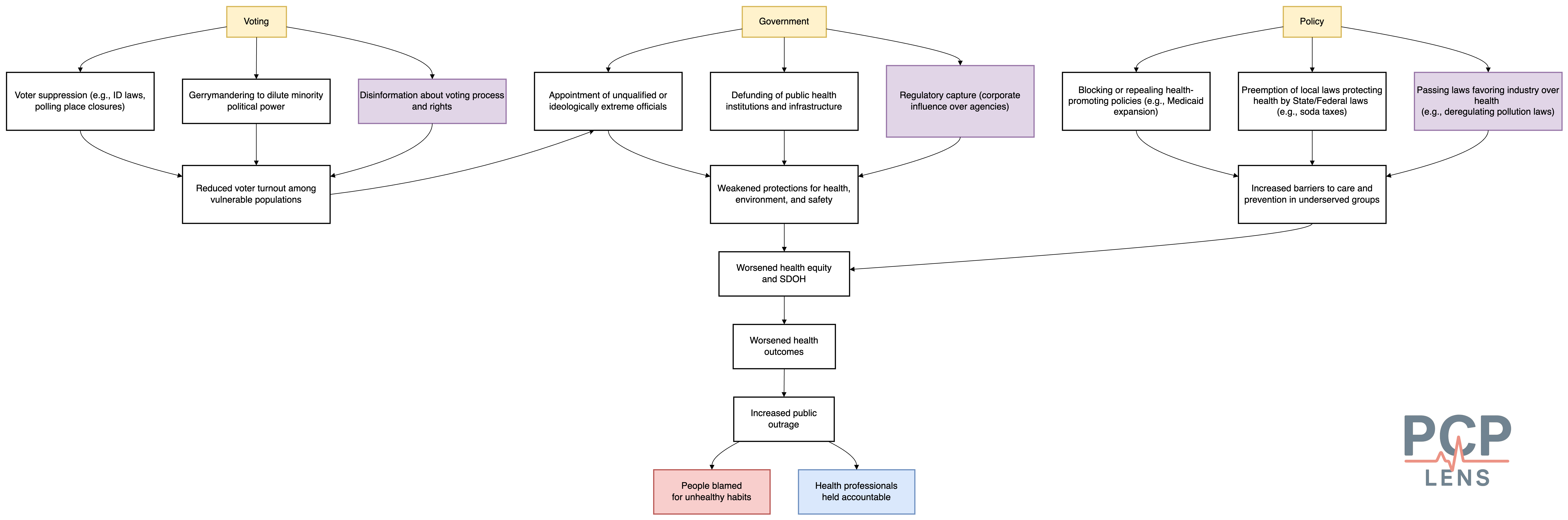 However, this interconnectedness also creates vulnerabilities within the system. The flowchart below illustrates how commercial (purple shaded nodes) and political actors can thwart the system, leading to poor health outcomes. This then leads to shifting blame to individuals, medical professionals, or both.