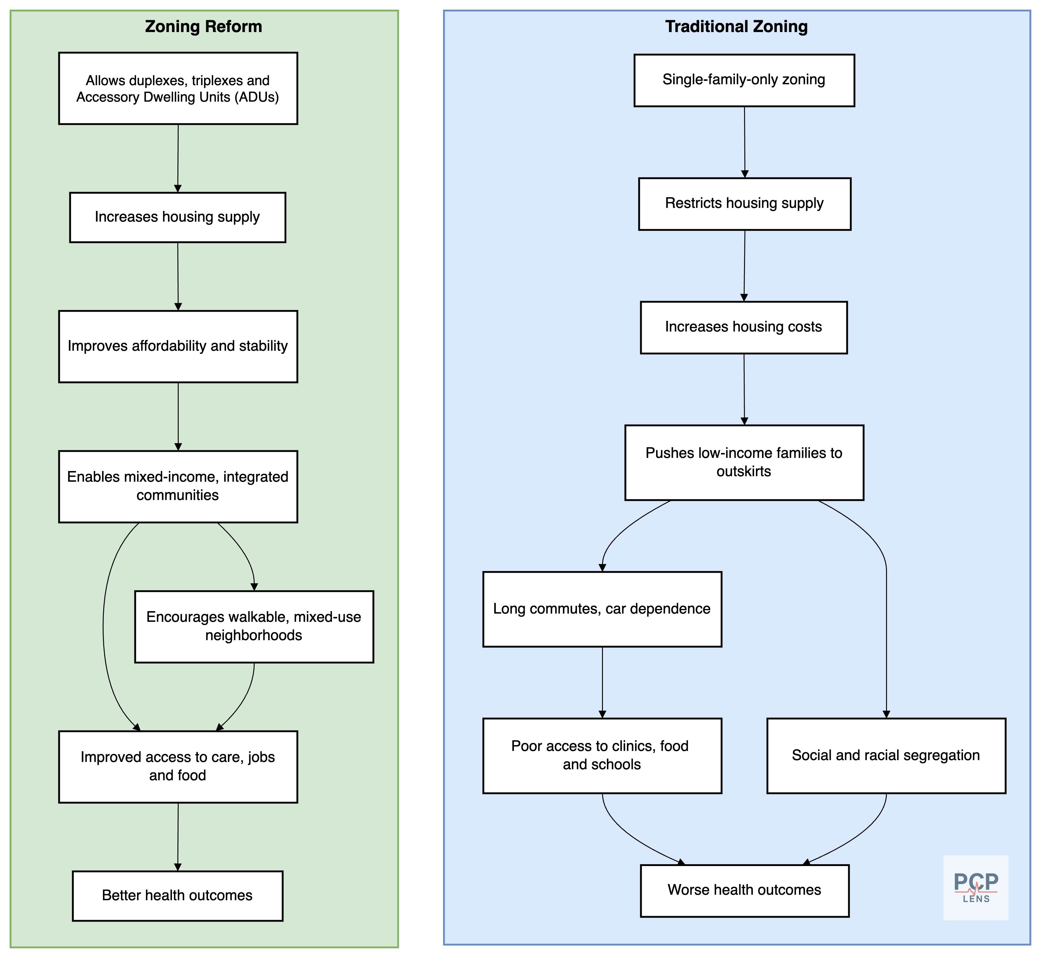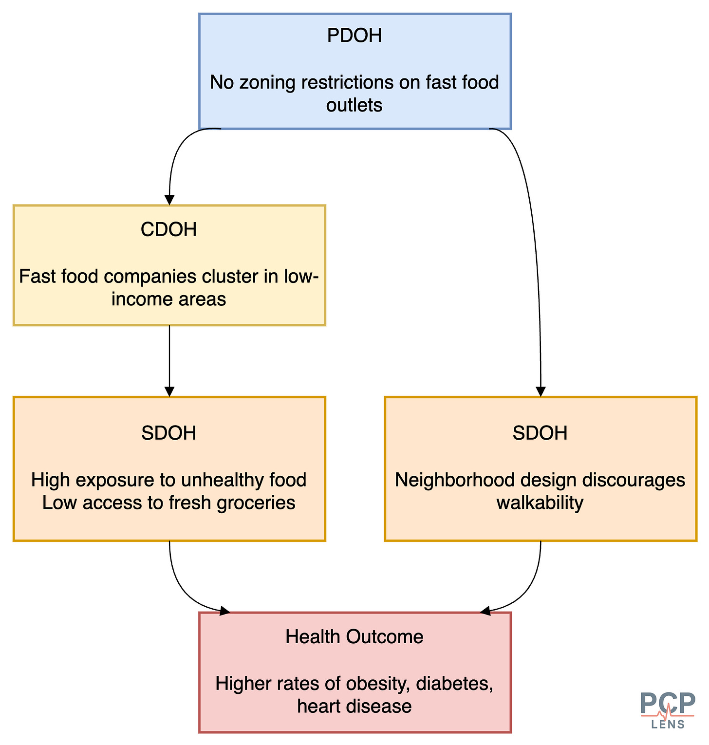 The relationship between PDOH and SDOH is causal and hierarchical. CDOH takes advantage of the conditions created by PDOH and SDOH to act as commercial parasites, extracting profits from a vulnerable society. The flowchart below illustrates one pathway by which zoning laws can lead to fast food companies proliferating in low-income areas, worsening health outcomes.