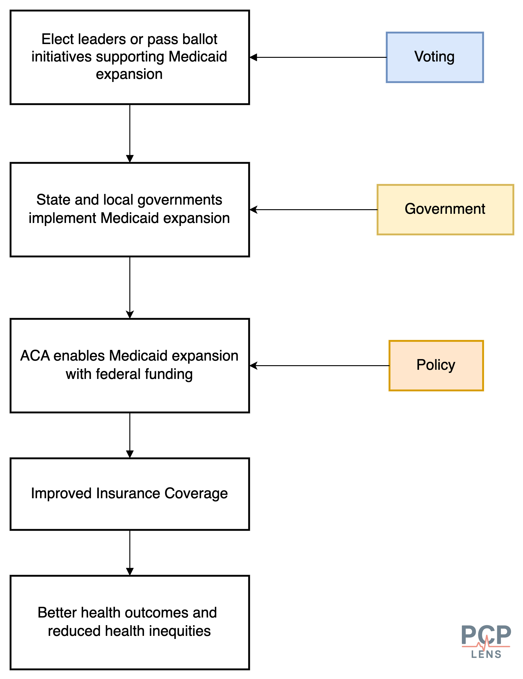 The flowchart below illustrates how a well-functioning system can expand health insurance coverage, especially for minority groups, when they are allowed to participate in the civic process.